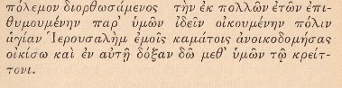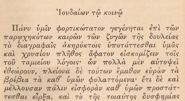 In times past, by far the most burdensome thing in the yoke of your slavery has been the fact that you were subjected to unauthorised ordinances and had to contribute an untold amount of money to the accounts of the treasury. Of this I used to see many instances with my own eyes, and I have learned of more, by finding the records which are preserved against you. Moreover, when a tax was about to be levied on you again I prevented it, and compelled the impiety of such obloquy to cease here; and I threw into the fire the records against you that were stored in my desks; so that it is no longer possible for anyone to aim at you such a reproach of impiety. My brother Constantius of honored memory was not so much responsible for these wrongs of yours as were the men who used to frequent his table, barbarians in mind, godless in soul. These I seized with my own hands and put them to death by thrusting them into the pit, that not even any memory of their destruction might still linger amongst us. And since I wish that you should prosper yet more, I have admonished my brother Iules, your most venerable patriarch, that the levy [αποστολη] which is said to exist among you should be prohibited, and that no one is any longer to have the power to oppress the masses of your people by such exactions; so that everywhere, during my reign, you may have security of mind, and in the enjoyment of peace may offer more fervid prayers for my reign to the Most High God, the Creator, who has deigned to crown me with his own immaculate right hand. For it is natural that men who are distracted by any anxiety should be hampered in spirit, and should not have so much confidence in raising their hands to pray; but that those who are in all respects free from care should rejoice with their whole hearts and offer their suppliant prayers on behalf of my imperial office to Mighty God, even to him who is able to direct my reign to the noblest ends, according to my purpose. This you ought to do, in order that, when I have successfully concluded the war with Persia, I may rebuild by my own efforts the sacred city of Jerusalem, which for so many years you have longed to see inhabited, and may bring settlers there, and, together with you, may glorify the Most High God therein.