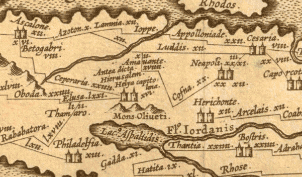 The Peutinger Map (TABULA PEUTINGERIANA) is an ITINERARIUM for the network of roads of the Roman Empire. It is a medieval copy of a 4th century revision of an original map. North is oriented to the right. Also, an enlargement of Jerusalem.