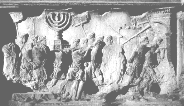 In 70 C.E. Titus, son of Roman Emperor Vespasian, plundered and destroyed first the Holy Temple of Jerusalem, and then the Holy City, slaughtering hundreds of thousands of Jews. The treasures of the Temple were enormous, including (1) the treasury of the Temple, always compounded yearly through tithes paid by faithful Jews in Jerusalem, Judea, and all parts of the world where Jews had settled through dispersions, (2) the gold furniture of the Temple, and the large number of gold vessels and utensils, (3) the enormous thick sheets of gold that covered the walls and doors of the Temple, and (4) the treasures of the wealthy that were safekept in the Temple. To celebrate this victory over the Jews, the great Triumphal Arch of Titus was constructed in the Forum of Rome, where it stands today. Its relief depicts Titus's army carrying the treasures of Jerusalem into Rome. As can be seen above, the focus of the procession is the large, solid gold Temple Menorah, whose capture was symbolic of the total subjugation of the Jews. The Temple plunder and slaughter, and the many tens of thousands of Jews also enslaved by Titus, provided Vespasian and Titus with the funds and labor required to build at this time the Great Colosseum of Rome.